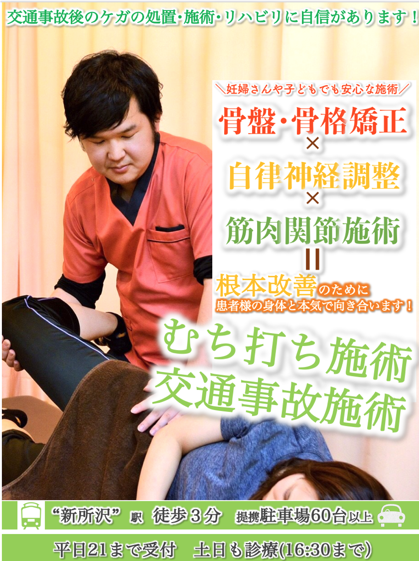 所沢で交通事故が原因のむち打ちを治療したい方がいらっしゃいましたら、所沢にある当院のスタッフがむち打ちの治療に実績豊富ですので、平日21:30まで営業している当院にぜひお越しください。2020/12/04